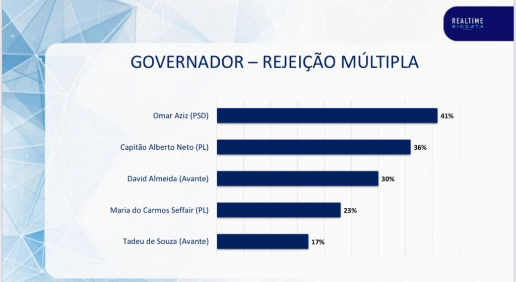 Pesquisa recente de intenções de voto divulgada pela Instituto Real Time Big Data revela que o senador Omar Aziz (PSD) é o que apresenta a maior rejeição entre todos os pré-candidatos ao Governo do Amazonas para as eleições do próximo ano.