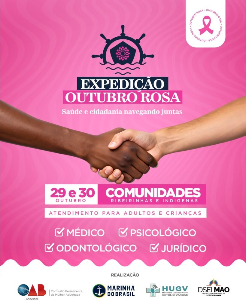 Manaus (Amazonas) – Nos dias 29 e 30 deste mês, uma parceria entre o Hospital Universitário Getúlio Vargas da Universidade Federal do Amazonas (HUGV-Ufam/Ebserh), a Marinha do Brasil e a seccional Amazonas da Ordem dos Advogados do Brasil, por meio da Comissão Permanente da Mulher Advogada, vai promover uma ação intitulada “Expedição Outubro Rosa – Saúde e Cidadania Navegando juntas!”, no Polo Base Nossa Senhora da Saúde, que integra o Distrito Sanitário Especial Indígena de Manaus (DSEI Manaus), com o propósito de fortalecer o cuidado integral à saúde da mulher, especialmente no contexto da atenção à população indígena.