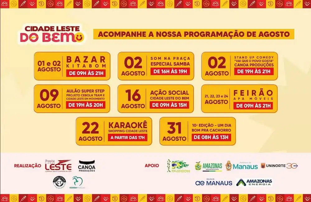 Durante todo o mês, a Zona Leste e parte da Zona Norte de Manaus contarão com uma agenda de atrações culturais e serviços gratuitos para diferentes faixas etárias. O Shopping Cidade Leste realiza o “Agosto do Bem”, com atividades voltadas ao mês dos pais, oferecendo programações que integram lazer, cidadania e prestação de serviços.