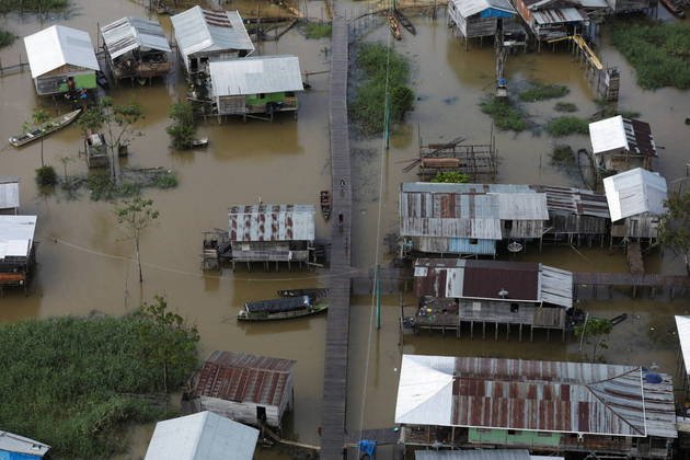 Imagem aérea traz detalhe de comunidade inundada pelo rio Javari, em Atalaia do Norte, Amazonas