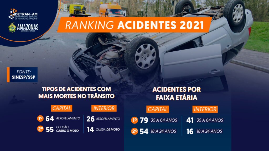 O número de acidentes de trânsito no Amazonas caiu 37% em 2021, em comparação ao ano anterior. De janeiro a dezembro do ano passado foram registrados 9.212 acidentes no estado, contra 14.569 em 2020. Os dados se referem à soma dos acidentes envolvendo vítimas fatais, vítimas lesionadas e danos materiais.