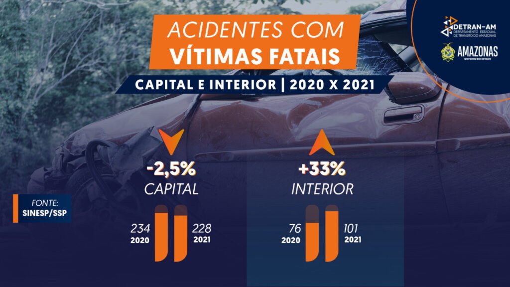 Apesar de uma redução de 2,5% na capital, os acidentes com vítimas fatais cresceram 6% no estado. Em Manaus, foram registrados 228 óbitos no ano passado, contra 234 em 2020. Já no interior ocorreram 101 mortes no trânsito em 2021, contra 76 em 2020.