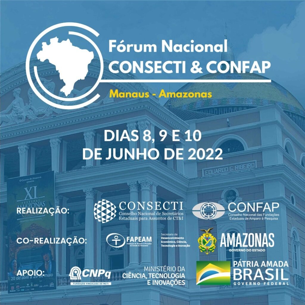 O Amazonas será a sede do Fórum Nacional do Conselho Nacional de Secretários Estaduais para Assuntos de Ciência, Tecnologia e Inovação (Consecti) e do Conselho Nacional das Fundações de Amparo à Pesquisa (Confap) 2022, que começa nesta quinta (9) e segue até sexta-feira (10). O evento também vai contar com o lançamento do Edital Amazônia+10.