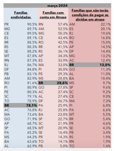 Em relação à inadimplência, o Rio Grande do Norte foi o estado que teve maior nível de famílias com contas em atraso (57,4%).