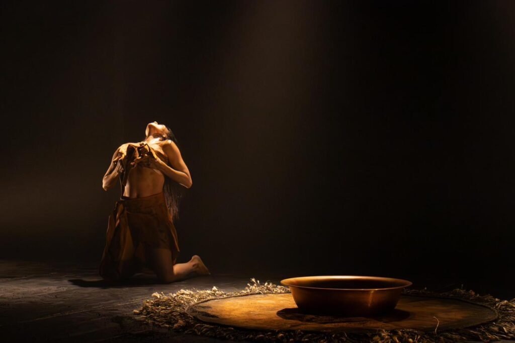 A dramaturgia, construída a partir de camadas sensoriais, reúne dança, canto, memória ancestral e uma forte presença sonora e visual.
