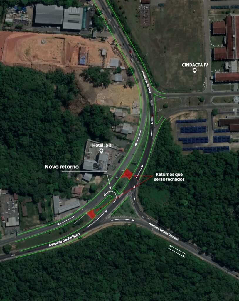 Neste local, popularmente conhecido como “saída do aeroporto”, serão retirados os dois retornos existentes e apenas um retorno será construído, permitindo que os condutores que trafegam no sentido Ponta Negra-Tarumã possam seguir adiante em direção à estrada do Tarumã ou convergir à esquerda para efetuar o retorno para a Ponta Negra.