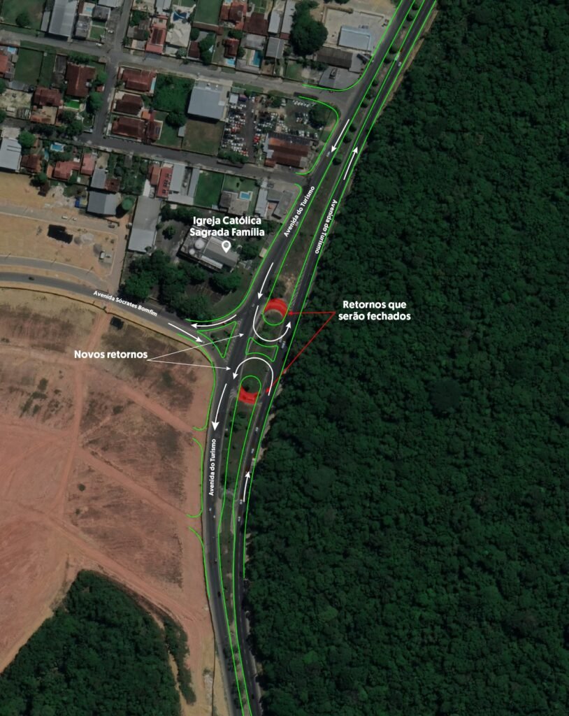 E os motoristas que estiverem saindo da avenida Sócrates Bonfim e quiserem ir para o sentido Ponta Negra-Tarumã, deverão seguir pela avenida do Turismo, sentido Ponta Negra, e efetuar o próximo retorno, em frente ao cemitério Nossa Senhora Aparecida (também conhecido como cemitério do Tarumã), para só então continuar o trajeto.