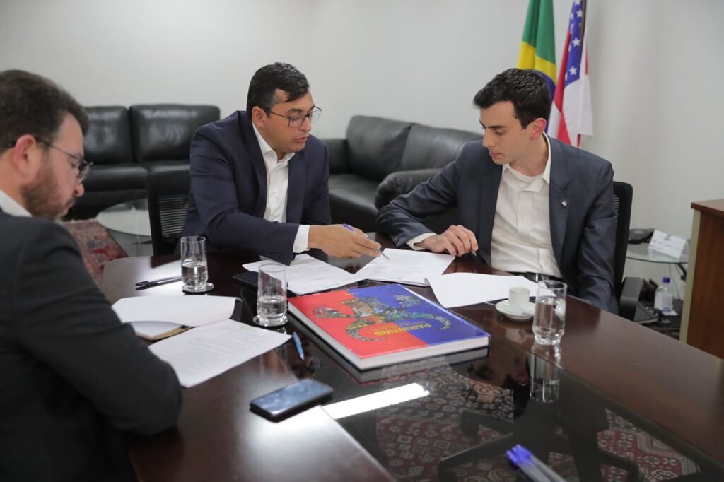 O governador do Amazonas, Wilson Lima, reuniu nesta segunda-feira (1), na sede da Secretaria de Relações Federativas e Internacionais (Serfi), em Brasília, com o vice-presidente da Azul Linhas Áreas, Fábio Campos, para tratar da ampliação das operações da empresa no Amazonas.