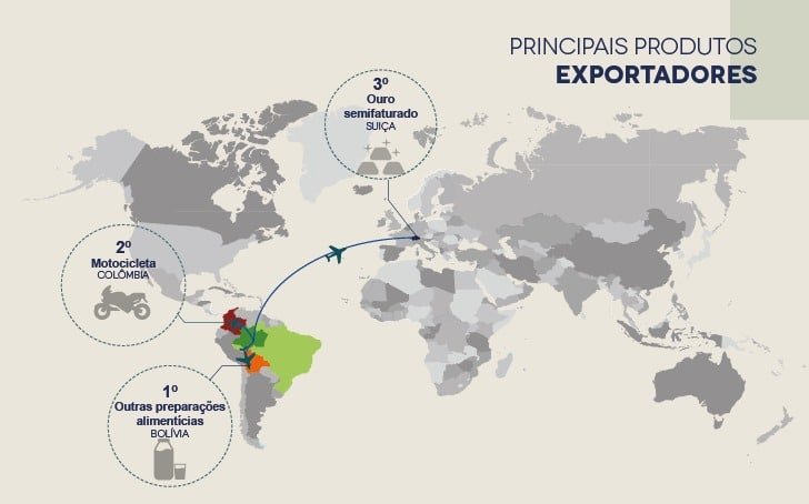 Em terceiro lugar na lista aparece o item “ouro (incluído o ouro platinado) em outras formas semimanufaturadas, para usos não monetários”, registrando o valor de pouco mais de US$6 milhões, o correspondente a 8,78% do total exportado. A Suíça foi o país que mais comprou esse item, ficando com 50,73% do montante.