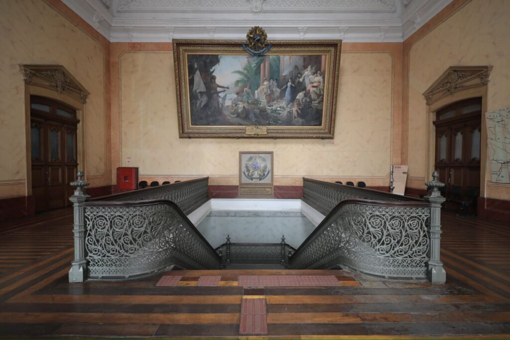 No segundo andar, a Biblioteca Pública encanta pela arquitetura. No teto, estão esculpidos os rostos de quatro famosas figuras representando as artes e letras: o jurista Teixeira de Freitas, o romancista Antônio Gonçalves Dias, o maestro Antônio Carlos Gomes e Johannes Gutenberg, criador da imprensa. Ao centro do hall superior, um quadro belíssimo chama a atenção dos visitantes: “A Redempção do Amazonas”, de Aurélio de Figueiredo. A obra que fala da abolição da escravatura no Amazonas tem dimensão de 6,65m x 3,65m.