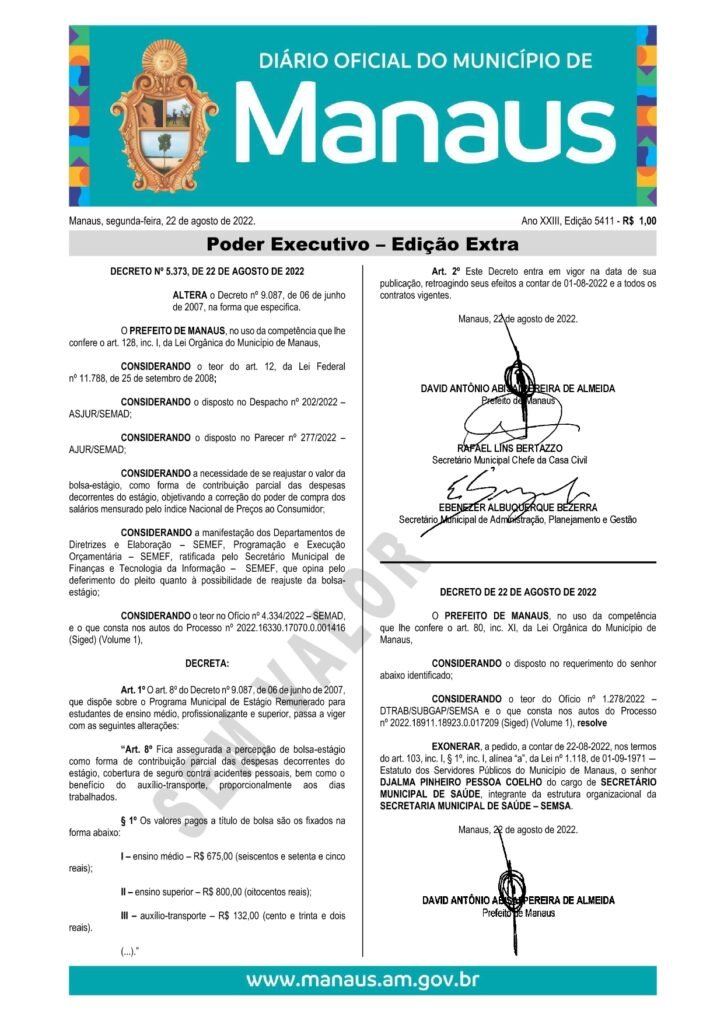 A Prefeitura de Manaus reajustou o bolsa-estágio. Para alunos do ensino médio, o valor passa de R$ 300 para R$ 675. Já para os estudantes de curso superior a bolsa passa de R$ 600 para R$ 800.