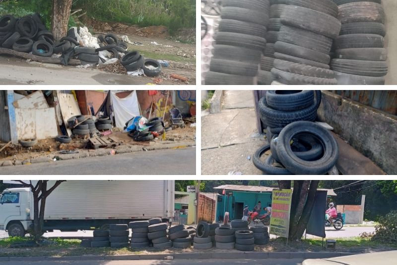 Em Manaus, pneus velhos são acumulados em calçadas, passeio público e entorno de borracharias. Em época de chuvas, tornam-se criadouros de insetos como o mosquito Aedes aegypti, transmissor da dengue, e poluem visualmente a cidade. Esse material possui grande potencial de reaproveitamento com a reciclagem.