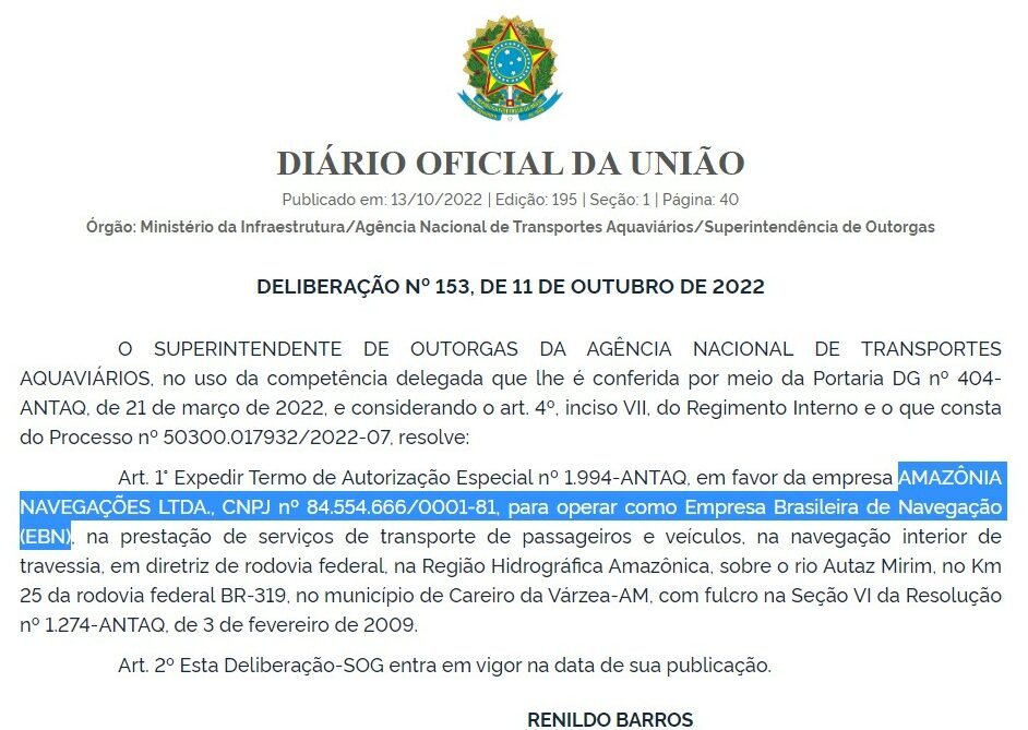 Conforme deliberação publicada no Diário Oficial da União (DOU) da última quinta-feira (13), a empresa Amazônia Navegações recebeu licença para operar como Empresa Brasileira de Navegação (EBN). Não há prazo de validade para a concessão.