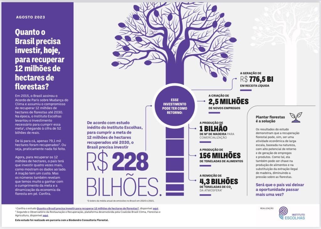 Para cumprir a meta assumida no Acordo de Paris (2015) de plantar 12 milhões de hectares de floresta até 2030, o Brasil precisa investir R$ 228 bilhões. A cifra é alta, mas seus desdobramentos positivos prometem ser ainda maiores. É o que mostra a onepage lançada pelo Instituto Escolhas, com os principais resultados de um estudo inédito.