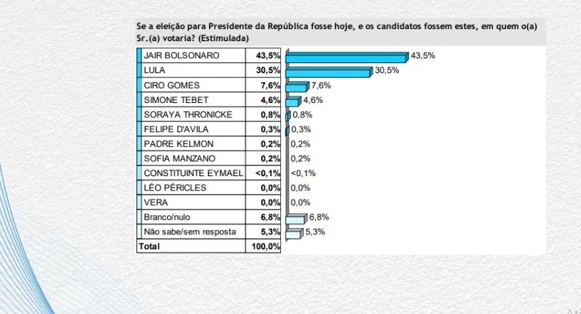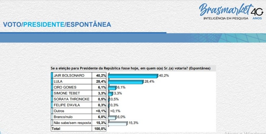 Ao contrário dos levantamentos de outros institutos de pesquisa divulgados nesta semana, como Ipec e Genial/Guaest, a Brasmarket mostra Bolsonaro na frente da disputa presidencial, tanto na pesquisa espontânea, quanto na estimulada -quando os nomes dos candidatos são apresentados ao entrevistado).