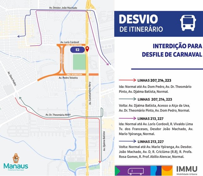No sábado (14/2), dia do desfile do Grupo Especial, a interdição na avenida Pedro Teixeira será ampliada entre a avenida Francisco Orellana (próximo ao hospital Tropical) e a avenida Constantino Nery, a partir das 8h. A alameda do Samba e a avenida Belmiro Vianez também estarão totalmente fechadas. O estacionamento será proibido em ambos os lados dessas vias, para viabilizar o deslocamento das alegorias. As interdições permanecem até as 8h de domingo, 15/2.