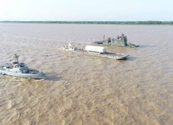Momento do resgate dos náufragos no Rio Amazonas. Foto: divulgação/Marinha do Brasil Navios da Marinha que escoltam a balsa que…