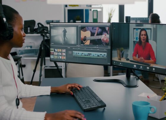 African woman editor with headset talking during online conference with partner on video call editing client work, getting feedback on…