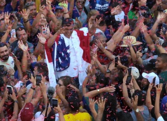 Com a bandeira do Amazonas nos ombros e cercado pelos eleitores, o governador Wilson Lima, candidato à reeleição pelo União…