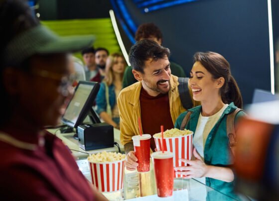 Happy couple buying drink and snack before movie projection in cinema. No próximo domingo (18), os ingressos para as salas…