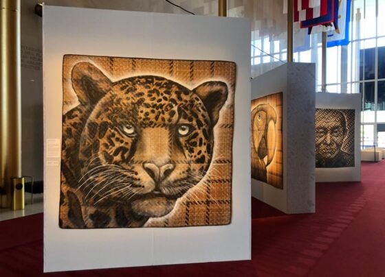 O grafiteiro amazonense, Raiz Campos, expõe obras feitas em esteiras indígenas até o próximo dia 17, no RiverRun Festival, no Centro…