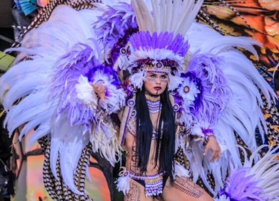Assim como no Festival Folclórico de Parintins, o Boi-Bumbá Caprichoso apresenta uma cunhã-poranga verdadeiramente indígena no show para turista na…
