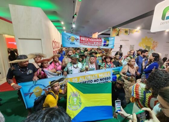 Representantes do Conselho Indígena Mura (CIM) de Autazes (AM) realizaram uma manifestação na sede da COP30, em Belém (PA), onde…