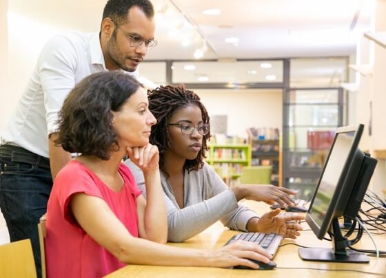 Tutor helping students in computer class. Man and women sitting and standing at desk, using desktop, pointing at monitor and…