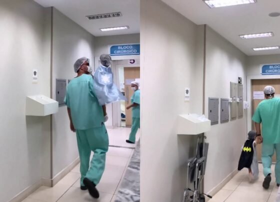 Um médico está fazendo sucesso nas redes sociais com vídeos levando crianças vestidas de super-heróis para a sala de cirurgia.…