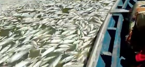 Um vídeo mostra milhares de peixes mortos por falta de oxigênio, em um lago da comunidade Paraná do Jussará, em…