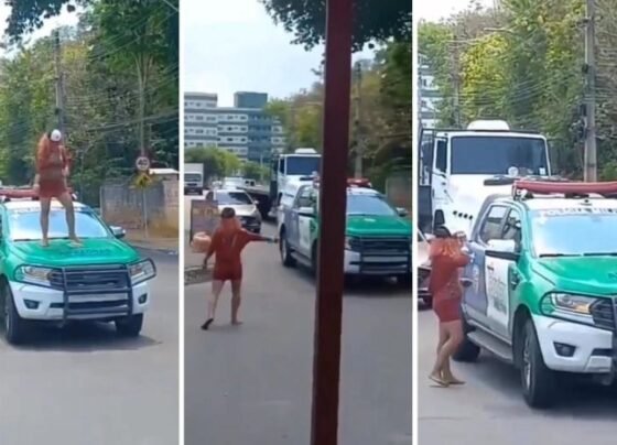 Uma mulher se empolgou e decidiu subir em cima do carro de viatura da Polícia Militar. A cena inusitada foi…