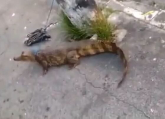 Jacaré é amarrado em poste no Centro de Manaus; vídeo