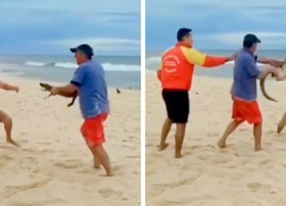 Para levar a melhor em uma briga na praia da Macumba, no Rio de Janeiro, um homem pegou um jacaré e usou como arma…