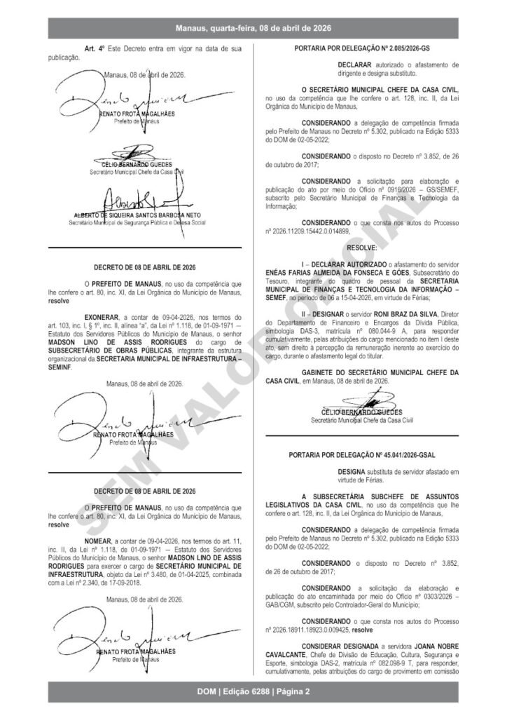 O prefeito Renato Frota Magalhães decretou situação anormal em Manaus por seis meses em decorrência das chuvas intensas. A decisão consta no Decreto nº 6.812, de 8 de abril de 2026, publicado no Diário Oficial do Município desta quarta-feira (8).