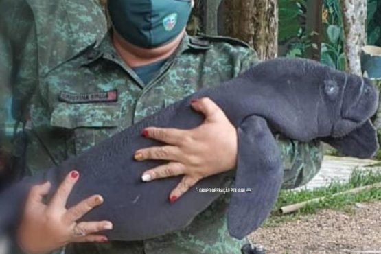 Um filhote de peixe-boi foi resgatado na manhã deste sábado (2), pelo Batalhão de Policiamento Ambiental, quando estava dentro de