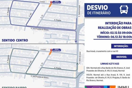 A rua Araxá, no cruzamento com a rua Professora Paes de Azevedo, no bairro Flores, zona Centro-Sul, será interditada a