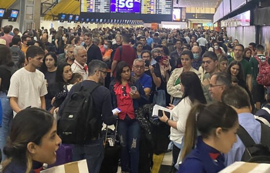 O Aeroporto de Congonhas, em São Paulo, registra grandes filas de passageiros tentando remarcar passagens na manhã desta sexta-feira (29). No fim