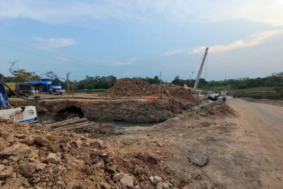 Obras na ponte sobre o Rio Curuçá têm apenas as colunas de concreto construídas – dois anos após quedas. O