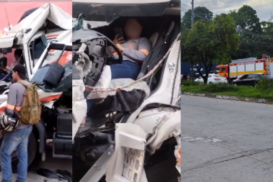 Um acidente com duas carretas nesta desta sexta-feira (28), deixou a motorista de um dos veículos com as pernas presas