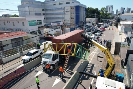 Carreta destrói limitador de altura de veículos em Manaus