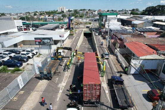 Carreta destrói limitador de altura em passagem subterrânea de Manaus;vídeo