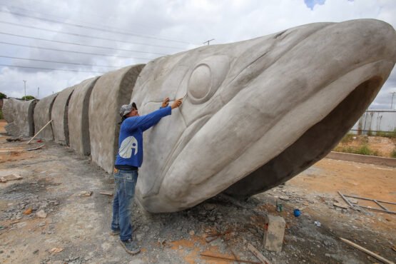 Parque aquático com esculturas de peixes gigantes no Amazonino Mendes