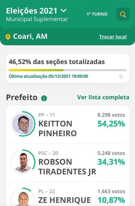O ex-vereador Keitton Pinheiro (PP) é o novo prefeito de Coari (370 km de Manaus) com 95,83% das urnas apuradas. Sobrinho do ex-prefeito Adail Pinheiro, condenado por pedofilia, e primo do também ex-prefeito cassado do município, Adail Filho, ele mantém a dinastia familiar à frente dos coarienses pelos próximos três anos, com 53,18% dos votos (17.268) contra do segundo colocado Robson Tiradentes Jr (PSC) – 35,13% (11.408).