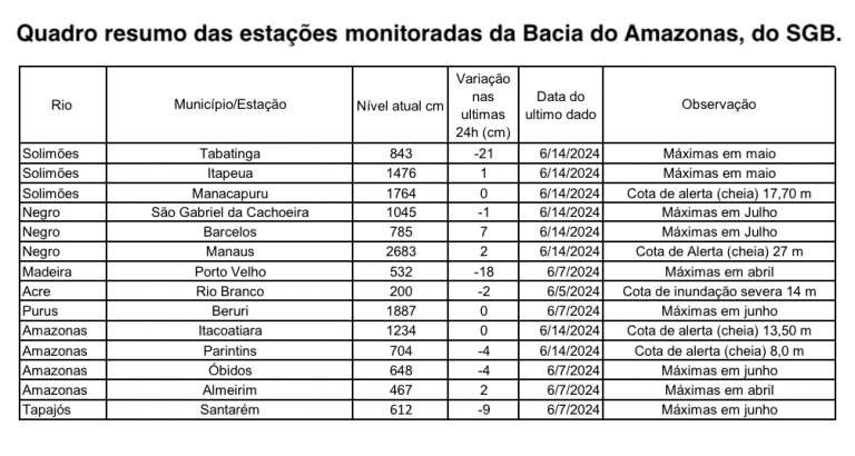 Acompanhando esta tendência de vazante, a estação de Fonte Boa (AM), no rio Solimões, já apresenta pequenas descidas diárias de 2 cm. Em Itapéua (Coari) e Manacapuru, o Solimões continuava subindo, com menor intensidade, apontando níveis abaixo da faixa da normalidade para o período.