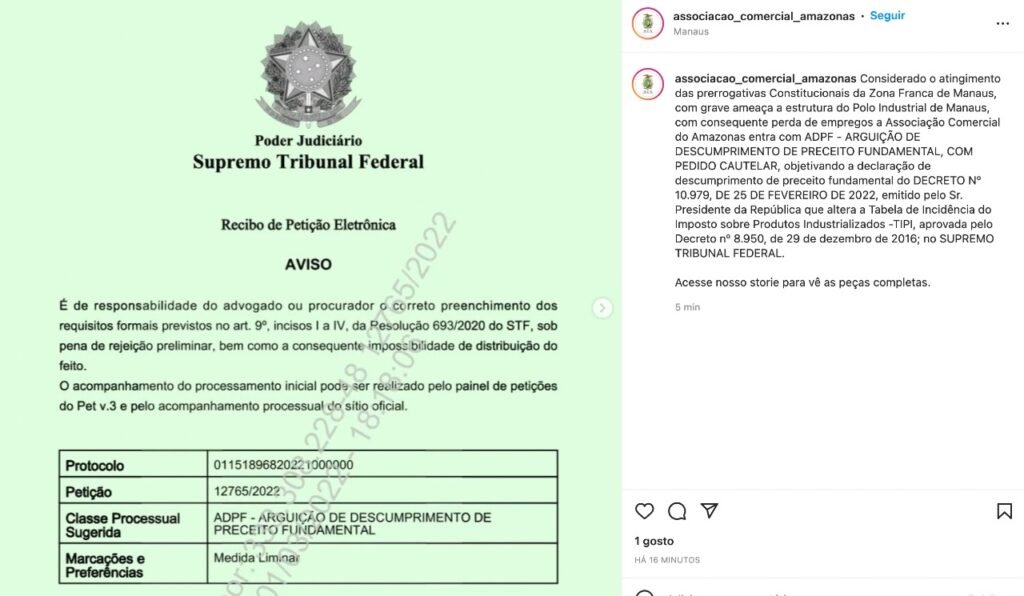 “Considerado o atingimento das prerrogativas Constitucionais da Zona Franca de Manaus, com grave ameaça a estrutura do Polo Industrial de Manaus, com consequente perda de empregos a Associação Comercial do Amazonas entra com ADPF – Arguição de Descumprimento de Preceito fundamental, com pedido cautelar. objetivando a declaração de descumprimento de preceito fundamental do Decreto Nº 10.979, de 25 de fevereiro de 2022, emitido pelo Sr. Presidente da República que altera a Tabela de Incidência do Imposto sobre Produtos Industrializados -TIPI, aprovada pelo Decreto nº 8.950, de 29 de dezembro de 2016; no Supremo Tribunal Federal”