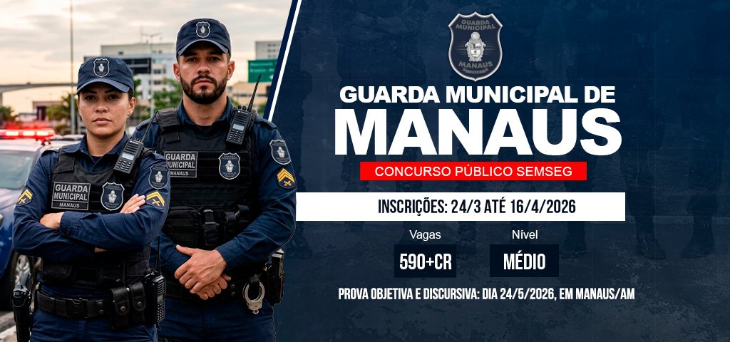 A Prefeitura de Manaus abriu as inscrições para o concurso público da Guarda Municipal, com oferta de 590 vagas para o cargo de Técnico Municipal I, além de cadastro reserva. Do total, 30 vagas são destinadas a Pessoas com Deficiência (PcD).