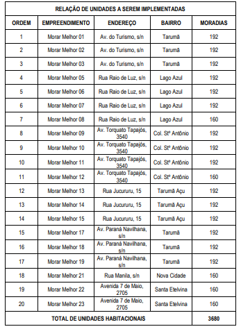 Manaus terá 3.680 imóveis do programa federal “Minha Casa Minha Vida”. As moradias serão construídas em seis bairros: Tarumã, Lago Azul, Colônia Santo Antônio, Nova Cidade e Santa Etelvina na zona norte da cidade; e Tarumã Açu na zona oeste.