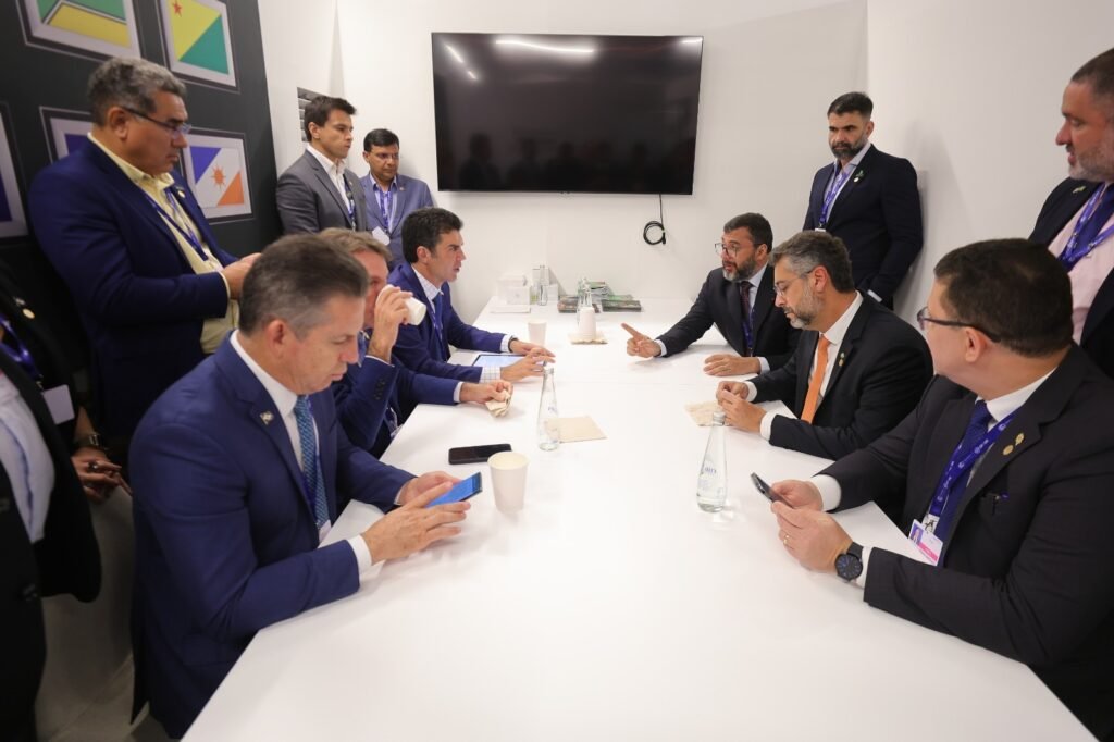 O debate “Transição econômica para a Amazônia: desenvolvimento socioeconômico de baixas emissões”, foi promovido pelo Consórcio Amazônia Legal durante a COP-28, em Dubai, nos Emirados Árabes. Além de Wilson Lima, participaram do evento os governadores Helder Barbalho (Pará), que preside o Consórcio da Amazônia Legal; Gladson Cameli (Acre), Clécio Luís (Amapá), Antônio Denarium (Roraima), Marcos Rocha (Rondônia), Mauro Mendes (Mato Grosso) e Wanderlei Barbosa (Tocantins).