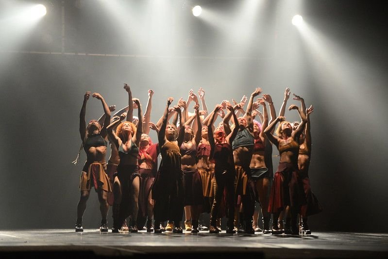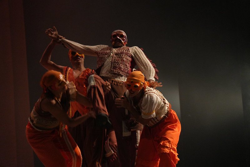 A encenação utiliza máscaras e elementos visuais para representar memórias e identidades em transformação, combinando dança e teatro em uma narrativa voltada à ideia de coletividade.