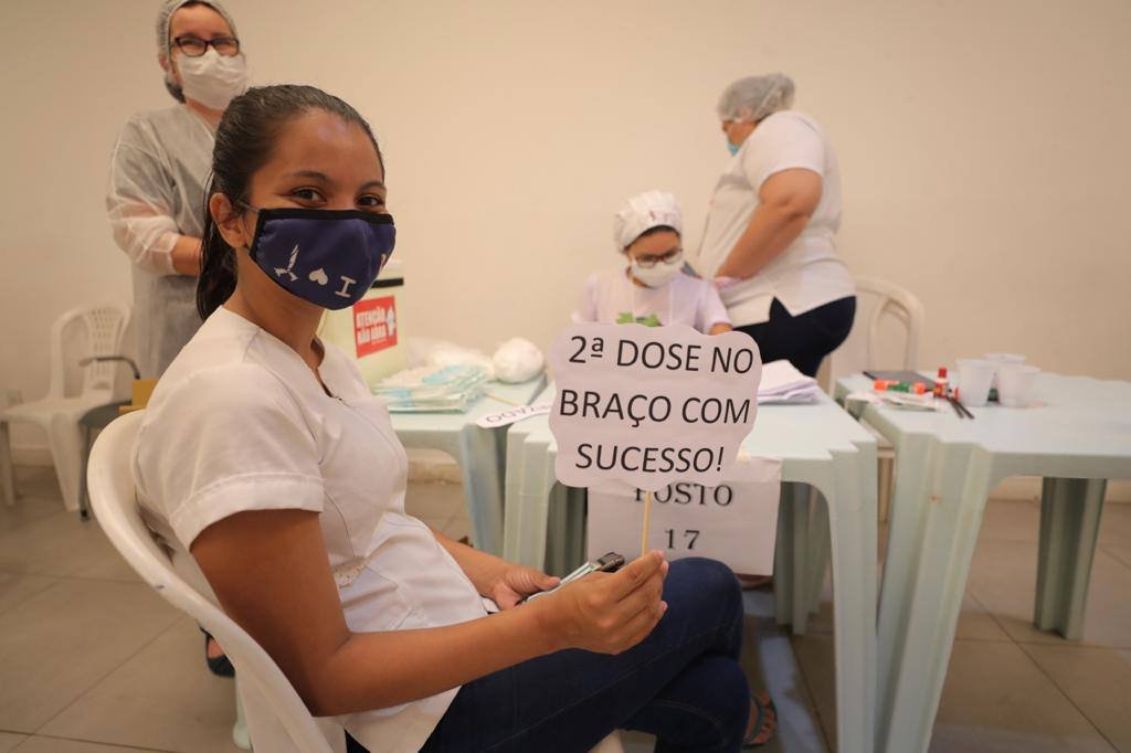 A técnica de enfermagem Vitória Sousa, de 22 anos, compareceu no sábado à noite no Centro de Convenções Vasco Vasques, onde recebeu recebeu a segunda dose da vacina.